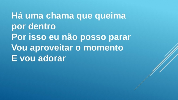 - Há uma chama que queima por dentroPor isso eu não posso pararVou aproveitar o momentoE vou adorar