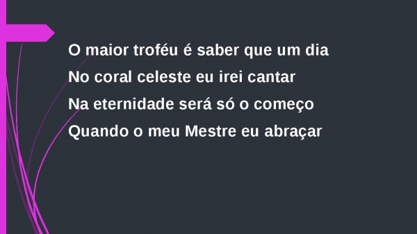 - O maior troféu é saber que um diaNo coral celeste eu irei cantarNa eternidade será só o começoQuando o meu Mestre eu abraçar