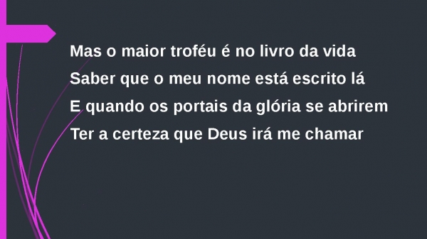 - Mas o maior troféu é no livro da vidaSaber que o meu nome está escrito láE quando os portais da glória se abriremTer a certeza que Deus irá me chamar