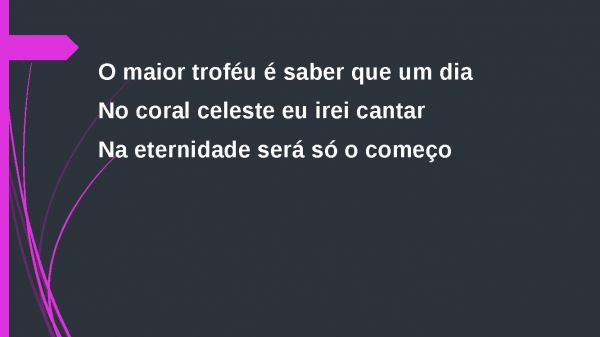 - O maior troféu é saber que um diaNo coral celeste eu irei cantarNa eternidade será só o começo