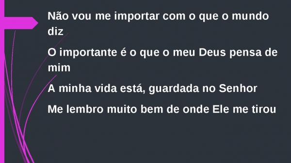 - Não vou me importar com o que o mundo dizO importante é o que o meu Deus pensa de mimA minha vida está, guardada no SenhorMe lembro muito bem de onde Ele me tirou