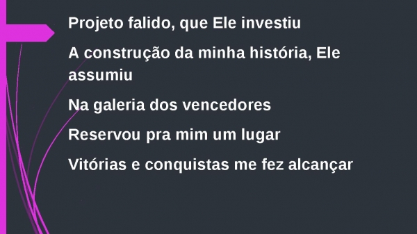 - Projeto falido, que Ele investiuA construção da minha história, Ele assumiuNa galeria dos vencedoresReservou pra mim um lugarVitórias e conquistas me fez alcançar