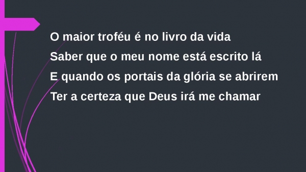 - O maior troféu é no livro da vidaSaber que o meu nome está escrito láE quando os portais da glória se abriremTer a certeza que Deus irá me chamar