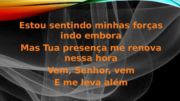 - Estou sentindo minhas forças indo emboraMas Tua presença me renova nessa horaVem, Senhor, vemE me leva além