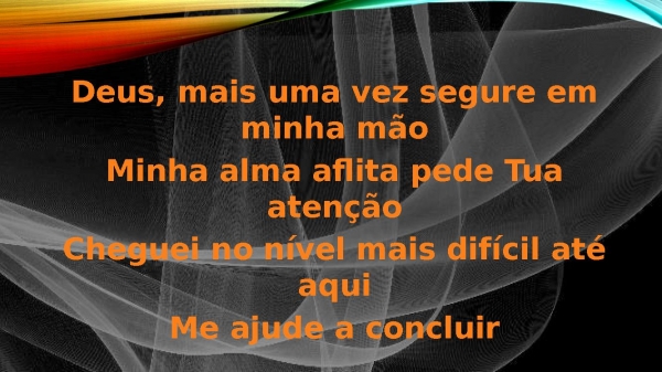 - Deus, mais uma vez segure em minha mãoMinha alma aflita pede Tua atençãoCheguei no nível mais difícil até aquiMe ajude a concluir