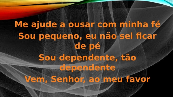 - Me ajude a ousar com minha féSou pequeno, eu não sei ficar de péSou dependente, tão dependenteVem, Senhor, ao meu favor