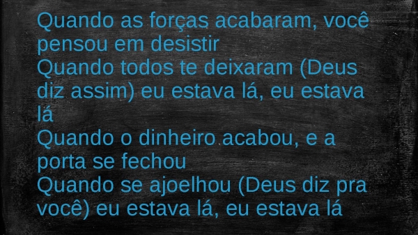- Quando as forças acabaram, você pensou em desistirQuando todos te deixaram (Deus diz assim) eu estava lá, eu estava láQuando o dinheiro acabou, e a porta se fechouQuando se ajoelhou (Deus diz pra você) eu estava lá, eu estava lá