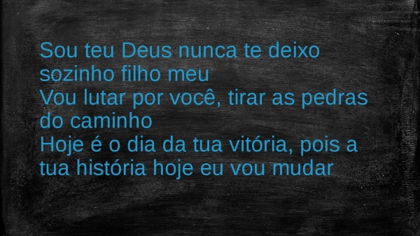 - Sou teu Deus nunca te deixo sozinho filho meuVou lutar por você, tirar as pedras do caminhoHoje é o dia da tua vitória, pois a tua história hoje eu vou mudar