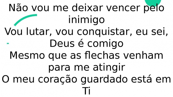 - Não vou me deixar vencer pelo inimigoVou lutar, vou conquistar, eu sei, Deus é comigoMesmo que as flechas venham para me atingirO meu coração guardado está em Ti