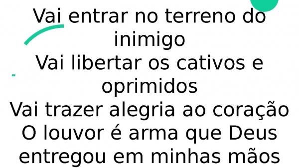 - Vai entrar no terreno do inimigoVai libertar os cativos e oprimidosVai trazer alegria ao coraçãoO louvor é arma que Deus entregou em minhas mãos
