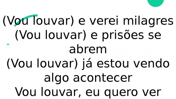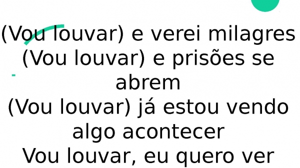 - (Vou louvar) e verei milagres(Vou louvar) e prisões se abrem(Vou louvar) já estou vendo algo acontecerVou louvar, eu quero ver