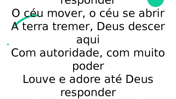 - O céu mover, o céu se abrirA terra tremer, Deus descer aquiCom autoridade, com muito poderLouve e adore até Deus responderO céu mover, o céu se abrirA terra tremer, Deus descer aquiCom autoridade, com muito poderLouve e adore até Deus responder