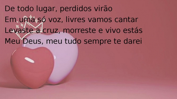 - De todo lugar, perdidos virãoEm uma só voz, livres vamos cantarLevaste a cruz, morreste e vivo estásMeu Deus, meu tudo sempre te darei