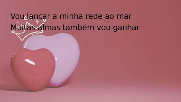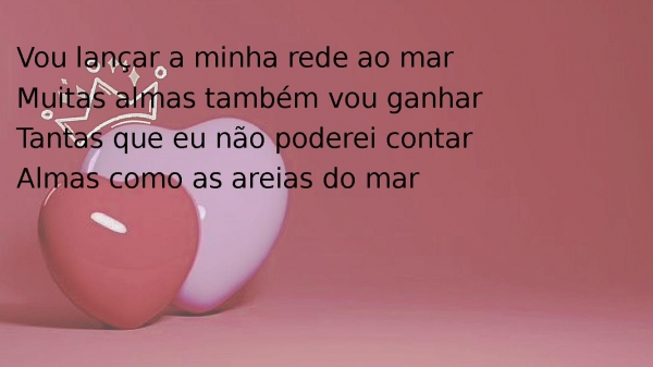 - Vou lançar a minha rede ao marMuitas almas também vou ganharTantas que eu não poderei contarAlmas como as areias do mar