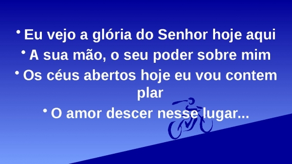 - Eu vejo a glória do Senhor hoje aquiA sua mão, o seu poder sobre mimOs céus abertos hoje eu vou contemplarO amor descer nesse lugar...