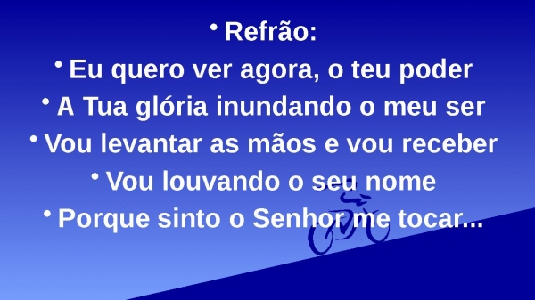 - Refrão:Eu quero ver agora, o teu poderA Tua glória inundando o meu serVou levantar as mãos e vou receberVou louvando o seu nomePorque sinto o Senhor me tocar...