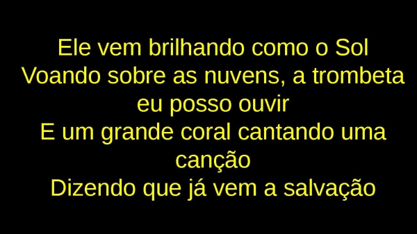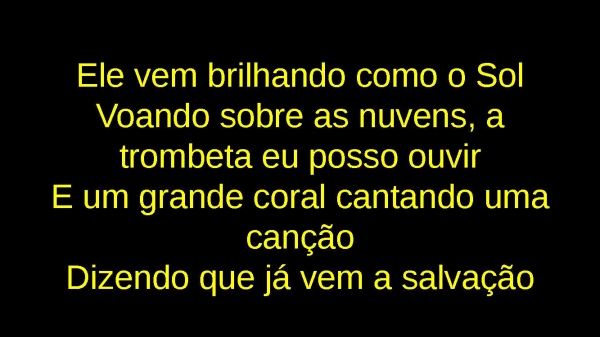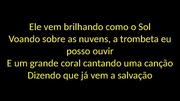 - Ele vem brilhando como o SolVoando sobre as nuvens, a trombeta eu posso ouvirE um grande coral cantando uma cançãoDizendo que já vem a salvação