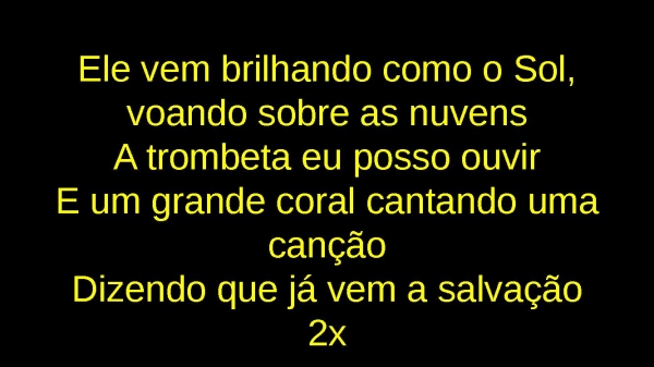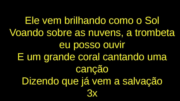 - Ele vem brilhando como o SolVoando sobre as nuvens, a trombeta eu posso ouvirE um grande coral cantando uma cançãoDizendo que já vem a salvação3x