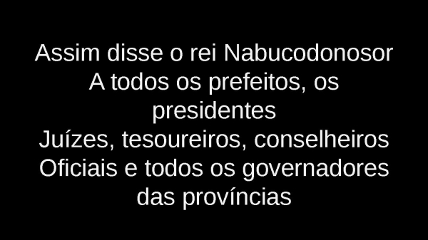 - Assim disse o rei NabucodonosorA todos os prefeitos, os presidentesJuízes, tesoureiros, conselheirosOficiais e todos os governadores das províncias