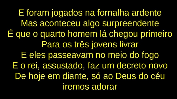 - E foram jogados na fornalha ardenteMas aconteceu algo surpreendenteÉ que o quarto homem lá chegou primeiroPara os três jovens livrarE eles passeavam no meio do fogoE o rei, assustado, faz um decreto novoDe hoje em diante, só ao Deus do céu iremos adorar