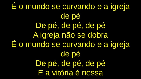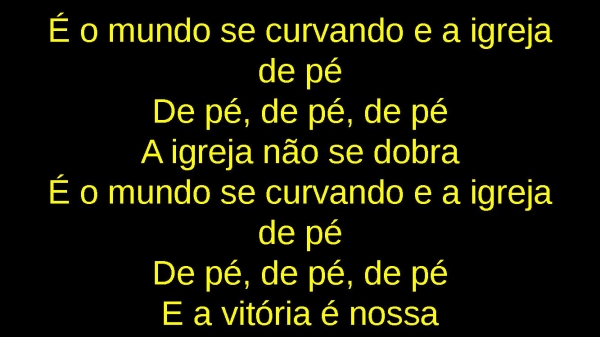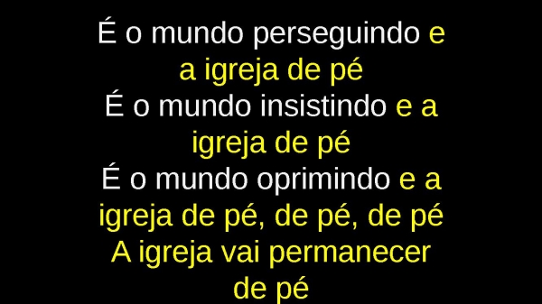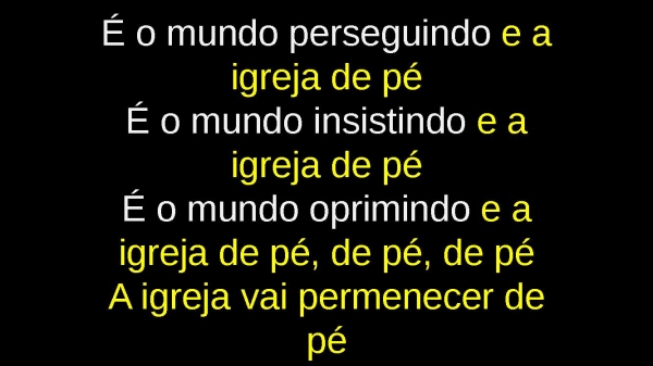 - É o mundo perseguindo e a igreja de péÉ o mundo insistindo e a igreja de péÉ o mundo oprimindo e a igreja de pé, de pé, de péA igreja vai permanecer de pé