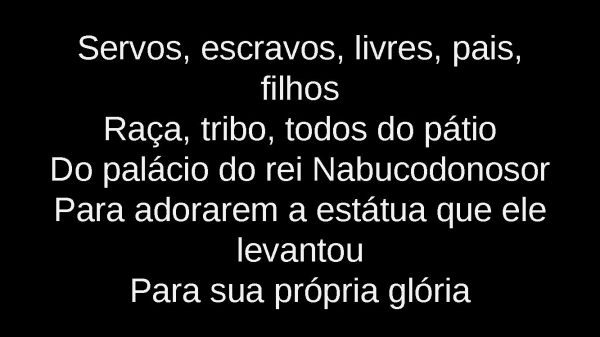 - Servos, escravos, livres, pais, filhosRaça, tribo, todos do pátioDo palácio do rei NabucodonosorPara adorarem a estátua que ele levantouPara sua própria glória
