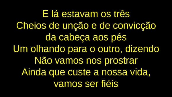 - E lá estavam os trêsCheios de unção e de convicção da cabeça aos pésUm olhando para o outro, dizendoNão vamos nos prostrarAinda que custe a nossa vida, vamos ser fiéis