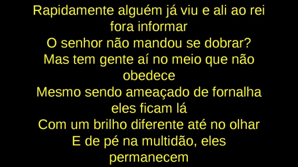 - Rapidamente alguém já viu e ali ao rei fora informarO senhor não mandou se dobrar?Mas tem gente aí no meio que não obedeceMesmo sendo ameaçado de fornalha eles ficam láCom um brilho diferente até no olharE de pé na multidão, eles permanecem