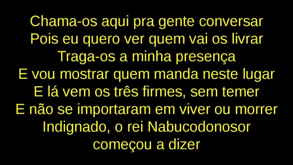 - Chama-os aqui pra gente conversarPois eu quero ver quem vai os livrarTraga-os a minha presençaE vou mostrar quem manda neste lugarE lá vem os três firmes, sem temerE não se importaram em viver ou morrerIndignado, o rei Nabucodonosor começou a dizer
