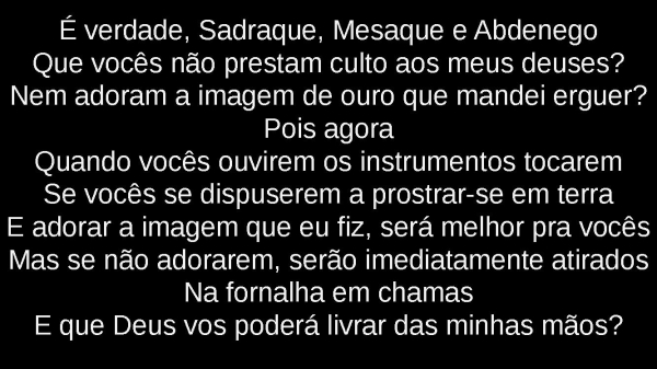 - É verdade, Sadraque, Mesaque e AbdenegoQue vocês não prestam culto aos meus deuses?Nem adoram a imagem de ouro que mandei erguer?Pois agoraQuando vocês ouvirem os instrumentos tocaremSe vocês se dispuserem a prostrar-se em terraE adorar a imagem que eu fiz, será melhor pra vocêsMas se não adorarem, serão imediatamente atiradosNa fornalha em chamasE que Deus vos poderá livrar das minhas mãos?