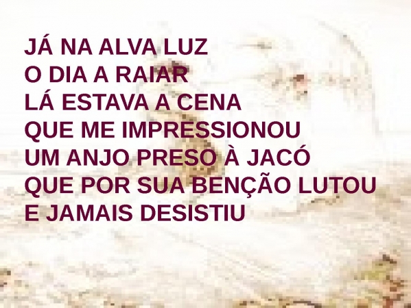 - JÁ NA ALVA LUZO DIA A RAIARLÁ ESTAVA A CENAQUE ME IMPRESSIONOUUM ANJO PRESO À JACÓQUE POR SUA BENÇÃO LUTOUE JAMAIS DESISTIU