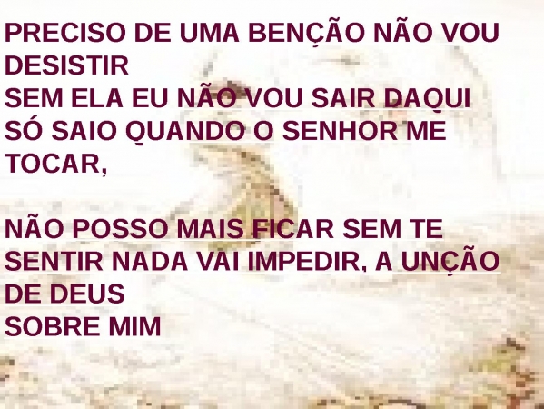 - PRECISO DE UMA BENÇÃO NÃO VOU DESISTIRSEM ELA EU NÃO VOU SAIR DAQUISÓ SAIO QUANDO O SENHOR METOCAR,NÃO POSSO MAIS FICAR SEM TE SENTIR NADA VAI IMPEDIR, A UNÇÃO DE DEUSSOBRE MIM