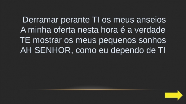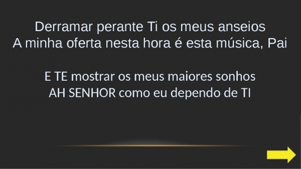 • Derramar perante TI os meus anseiosA minha oferta nesta hora é esta música, PaiE te mostrar os meus maiores sonhosAH SENHOR como eu dependo de TI…Derramar perante Ti os meus anseiosA minha oferta nesta hora é esta música, PaiE TE mostrar os meus maiores sonhosAH SENHOR como eu dependo de TI
