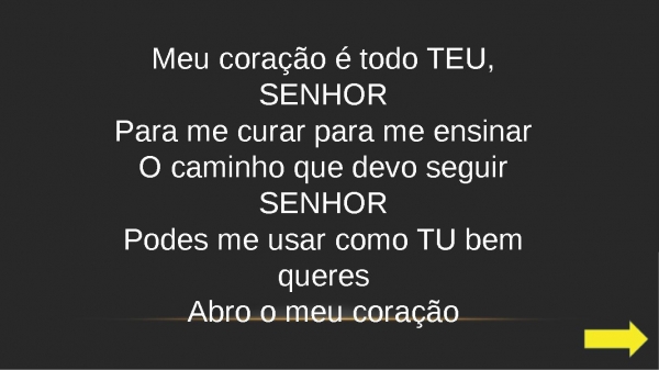 • Derramar perante TI os meus anseiosA minha oferta nesta hora é esta música, PaiE te mostrar os meus maiores sonhosAH SENHOR como eu dependo de TI…Meu coração é todo TEU, SENHORPara me curar para me ensinarO caminho que devo seguir SENHORPodes me usar como TU bem queresAbro o meu coração