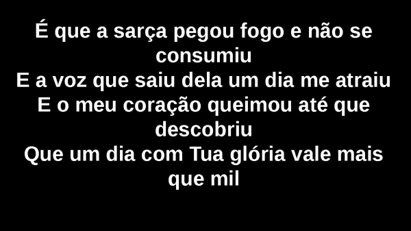 - É que a sarça pegou fogo e não se consumiuE a voz que saiu dela um dia me atraiuE o meu coração queimou até que descobriuQue um dia com Tua glória vale mais que mil