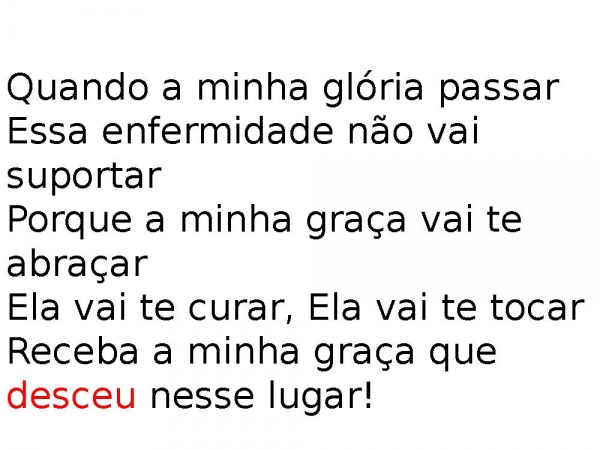 - Quando a minha glória passarEssa enfermidade não vai suportarPorque a minha graça vai te abraçarEla vai te curar, Ela vai te tocarReceba a minha graça que desceu nesse lugar!