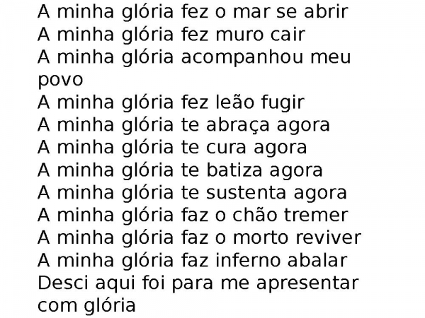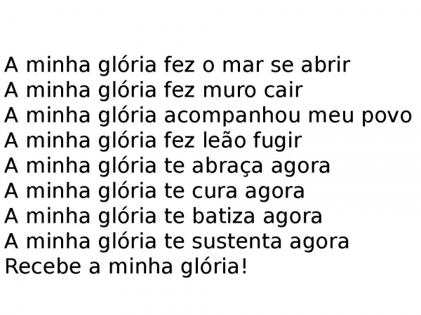 - A minha glória fez o mar se abrirA minha glória fez muro cairA minha glória acompanhou meu povoA minha glória fez leão fugirA minha glória te abraça agoraA minha glória te cura agoraA minha glória te batiza agoraA minha glória te sustenta agoraRecebe a minha glória!