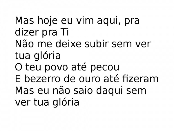 - Mas hoje eu vim aqui, pra dizer pra TiNão me deixe subir sem ver tua glóriaO teu povo até pecouE bezerro de ouro até fizeramMas eu não saio daqui sem ver tua glória