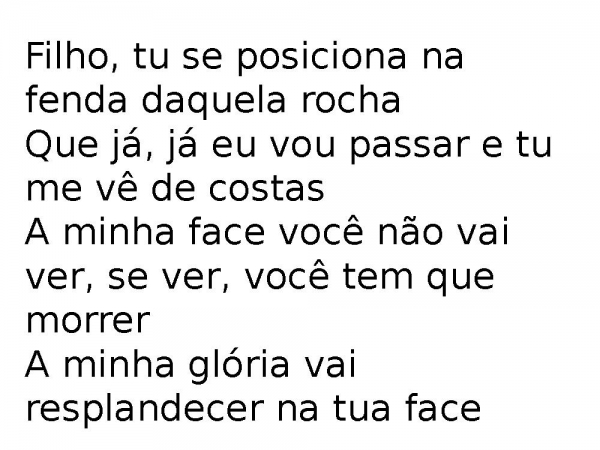 - Filho, tu se posiciona na fenda daquela rochaQue já, já eu vou passar e tu me vê de costasA minha face você não vai ver, se ver, você tem que morrerA minha glória vai resplandecer na tua face