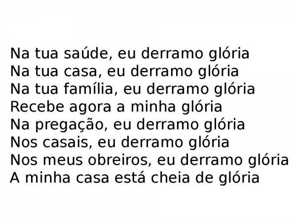 - Na tua saúde, eu derramo glóriaNa tua casa, eu derramo glóriaNa tua família, eu derramo glóriaRecebe agora a minha glóriaNa pregação, eu derramo glóriaNos casais, eu derramo glóriaNos meus obreiros, eu derramo glóriaA minha casa está cheia de glória
