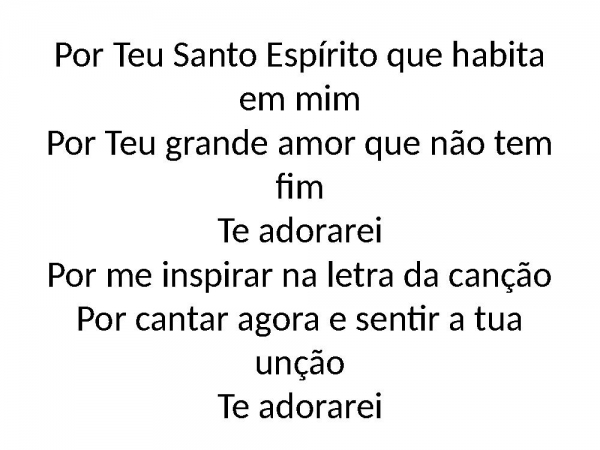 - Por Teu Santo Espírito que habita em mimPor Teu grande amor que não tem fimTe adorareiPor me inspirar na letra da cançãoPor cantar agora e sentir a tua unçãoTe adorarei