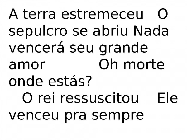 - A terra estremeceu O sepulcro se abriu Nada vencerá seu grande amor Oh morte onde estás? O rei ressuscitou Ele venceu pra sempre