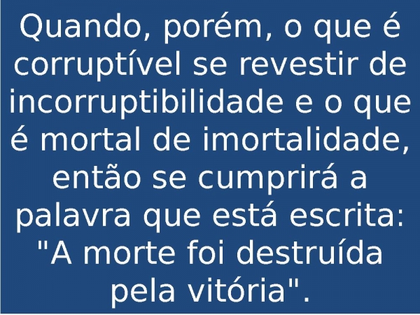 - Quando, porém, o que é corruptível se revestir de incorruptibilidade e o que é mortal de imortalidade, então se cumprirá a palavra que está escrita: "A morte foi destruída pela vitória".