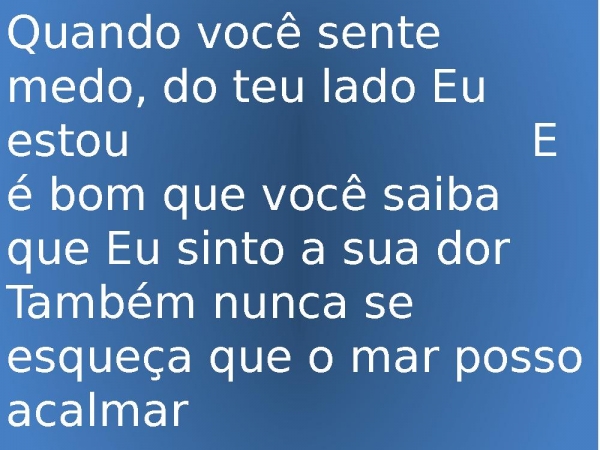 - Quando você sente medo, do teu lado Eu estou E é bom que você saiba que Eu sinto a sua dor Também nunca se esqueça que o mar posso acalmar