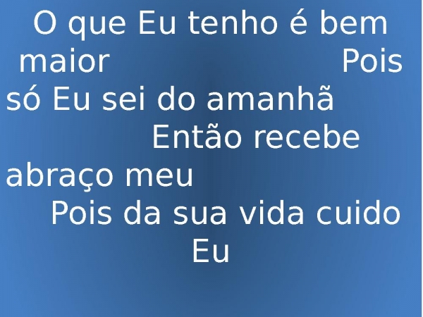 - O que Eu tenho é bem maior Pois só Eu sei do amanhã Então recebe abraço meu Pois da sua vida cuido Eu
