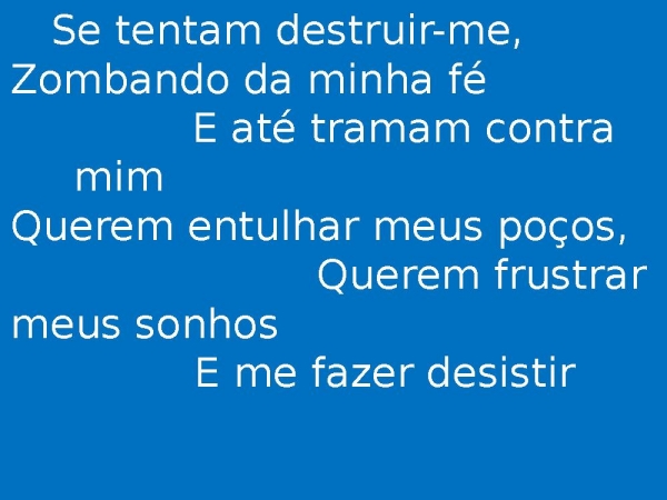 - Se tentam destruir-me, Zombando da minha fé E até tramam contra mim Querem entulhar meus poços, Querem frustrar meus sonhos E me fazer desistir