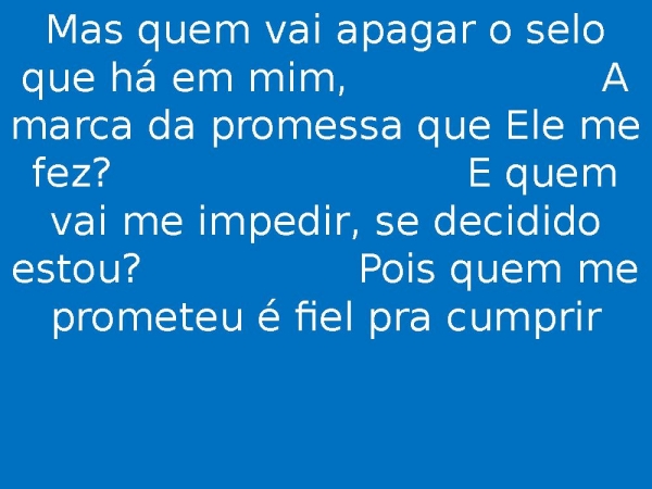 - Mas quem vai apagar o selo que há em mim, A marca da promessa que Ele me fez? E quem vai me impedir, se decidido estou? Pois quem me prometeu é fiel pra cumprir