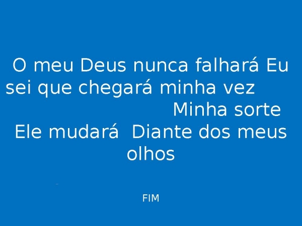 - O meu Deus nunca falhará Eu sei que chegará minha vez Minha sorte Ele mudará Diante dos meus olhosFIM
