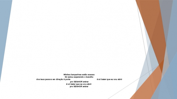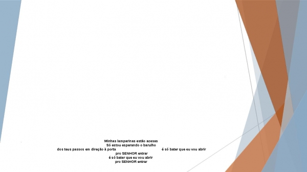 - Minhas lamparinas estão acesasSó estou esperando o barulho dos teus passos em direção à porta é só bater que eu vou abrir pro SENHOR entraré só bater que eu vou abrir pro SENHOR entrar