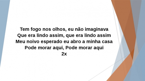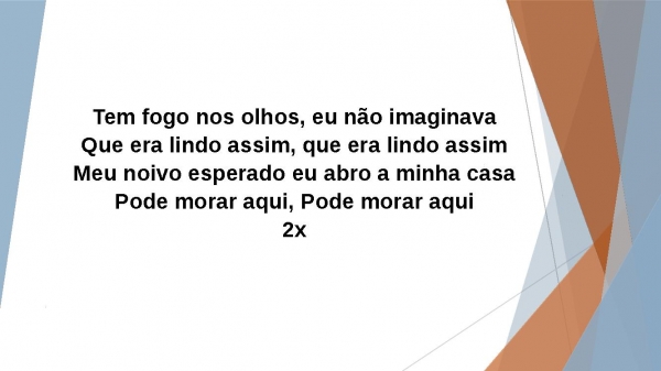 - Tem fogo nos olhos, eu não imaginavaQue era lindo assim, que era lindo assimMeu noivo esperado eu abro a minha casaPode morar aqui, Pode morar aqui2x